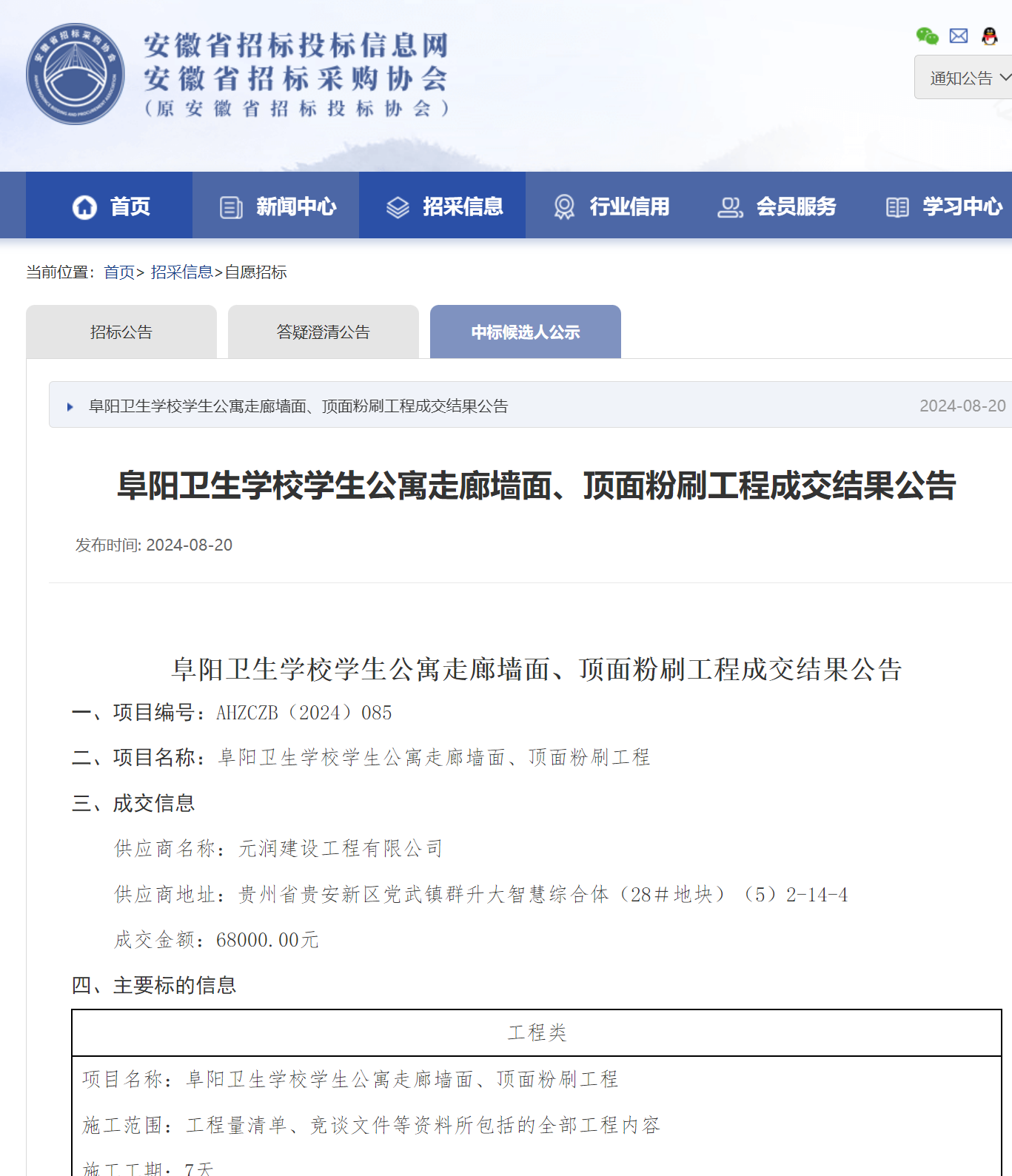 阜阳卫生学校学生公寓走廊墙面、顶面粉刷工程